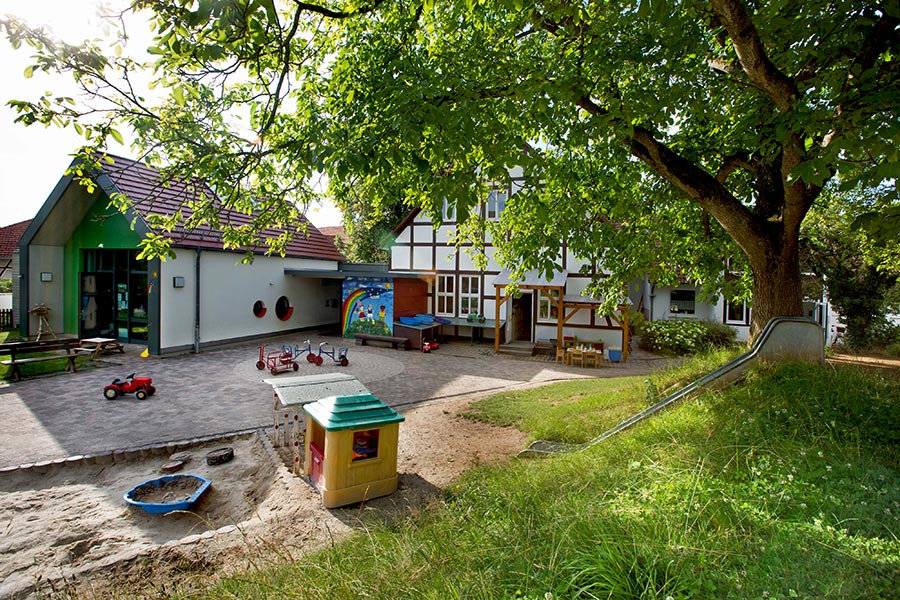 Unsere Einrichtung befindet sich im Ortskern von Berndorf, direkt neben dem Pfarrhaus. Auf der gegenüberliegenden Seite befindet sich die Kirche. In der Nähe der Kindertagesstätte befindet sich eine Bushaltestelle mit Anbindung an das nahegelegene Korbach.