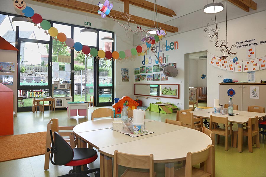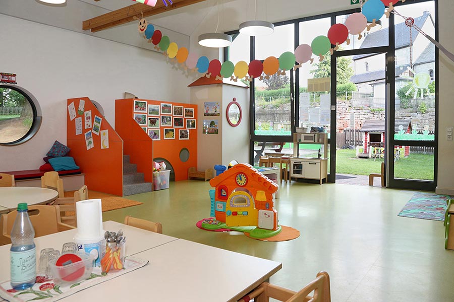 Die Krippe befindet sich in einem 2013 errichteten Neubau. Die drei altersübergreifenden Gruppen sind auf zwei Ebenen im Altbau untergebracht.