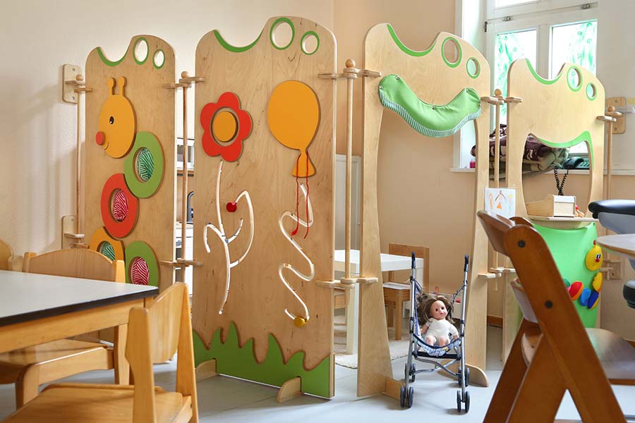 Die räumliche Ausgestaltung orientiert sich an den Bedürfnissen der uns anvertrauten Kinder. Gemeinsames Spielen ist ebenso wichtig wie vorübergehender Rückzug. Klare Raumstrukturen unterstützen die Orientierung des Kindes im Raum.