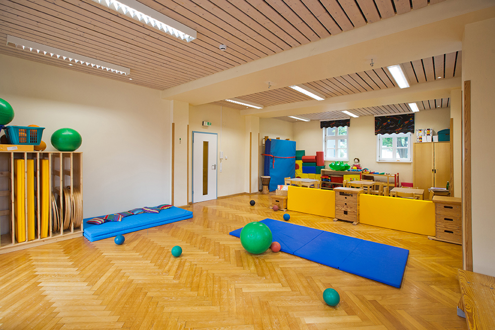 Außerdem zählen Küche, Hauswirtschafts- und Materialkammer und im Personaltrakt Büro, Mitarbeiterraum und Toilette zum Raumangebot.