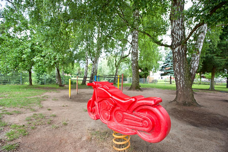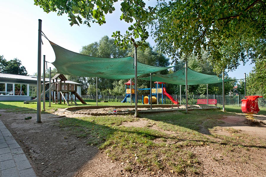 Unser naturnahes Außengelände zeichnet sich besonders durch den alten Baumbestand aus, der selbst im Hochsommer einen Großteil des Spielplatzes beschattet.