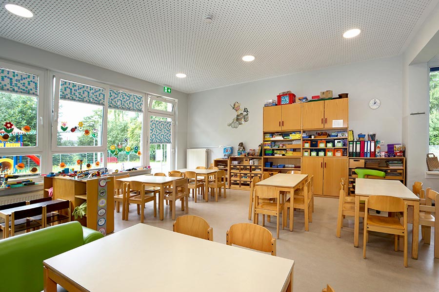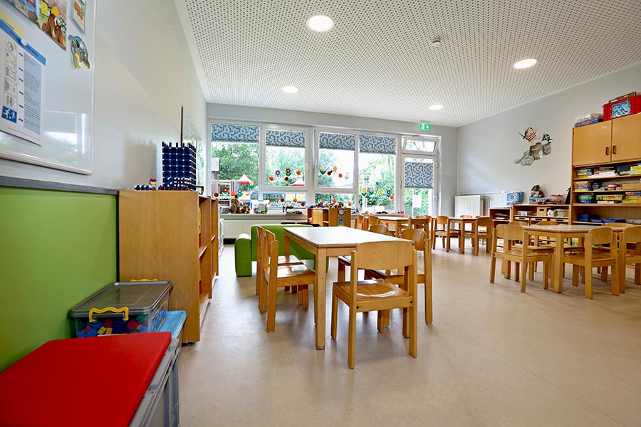 Neben den drei Gruppenräumen besteht die Einrichtung aus einem Mehrzweckraum, einem Personalraum, hauswirtschaftlichen Räumen und einem lichtdurchfluteten Wintergarten – genug Platz, damit Kinder spielen, lernen und sich entfalten können.
