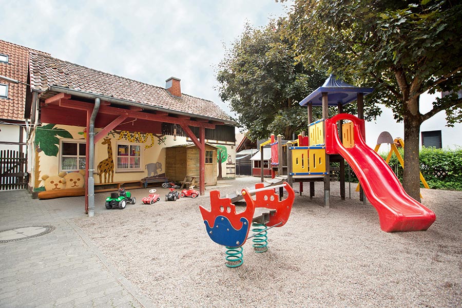 Der Spielplatz ist mit einem Sandkasten, einer Schaukel, einem Klettergerüst, einer Federwippe und zwei Spielhäuschen ausgestattet.